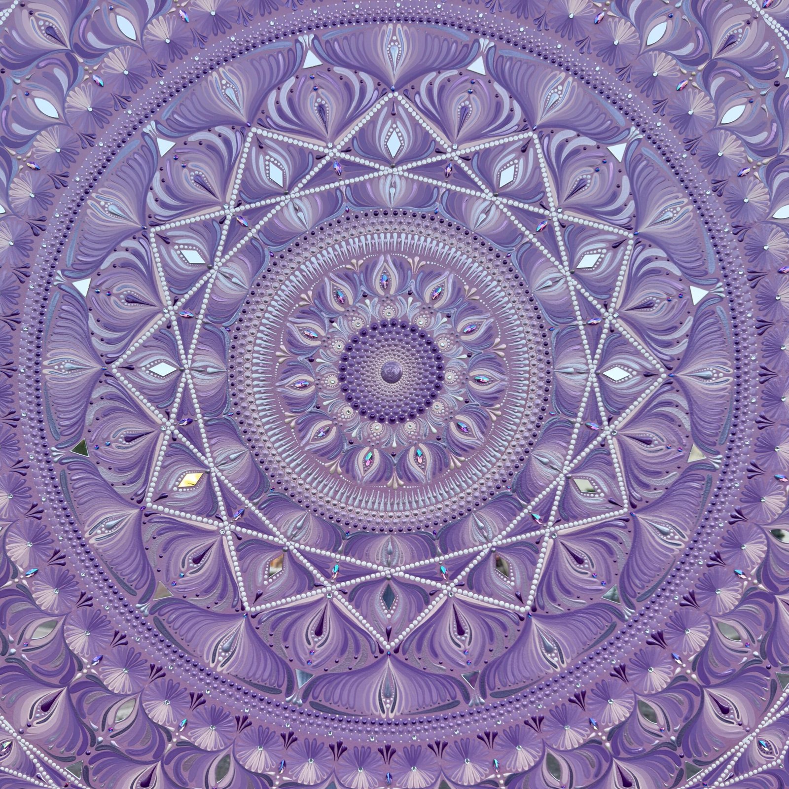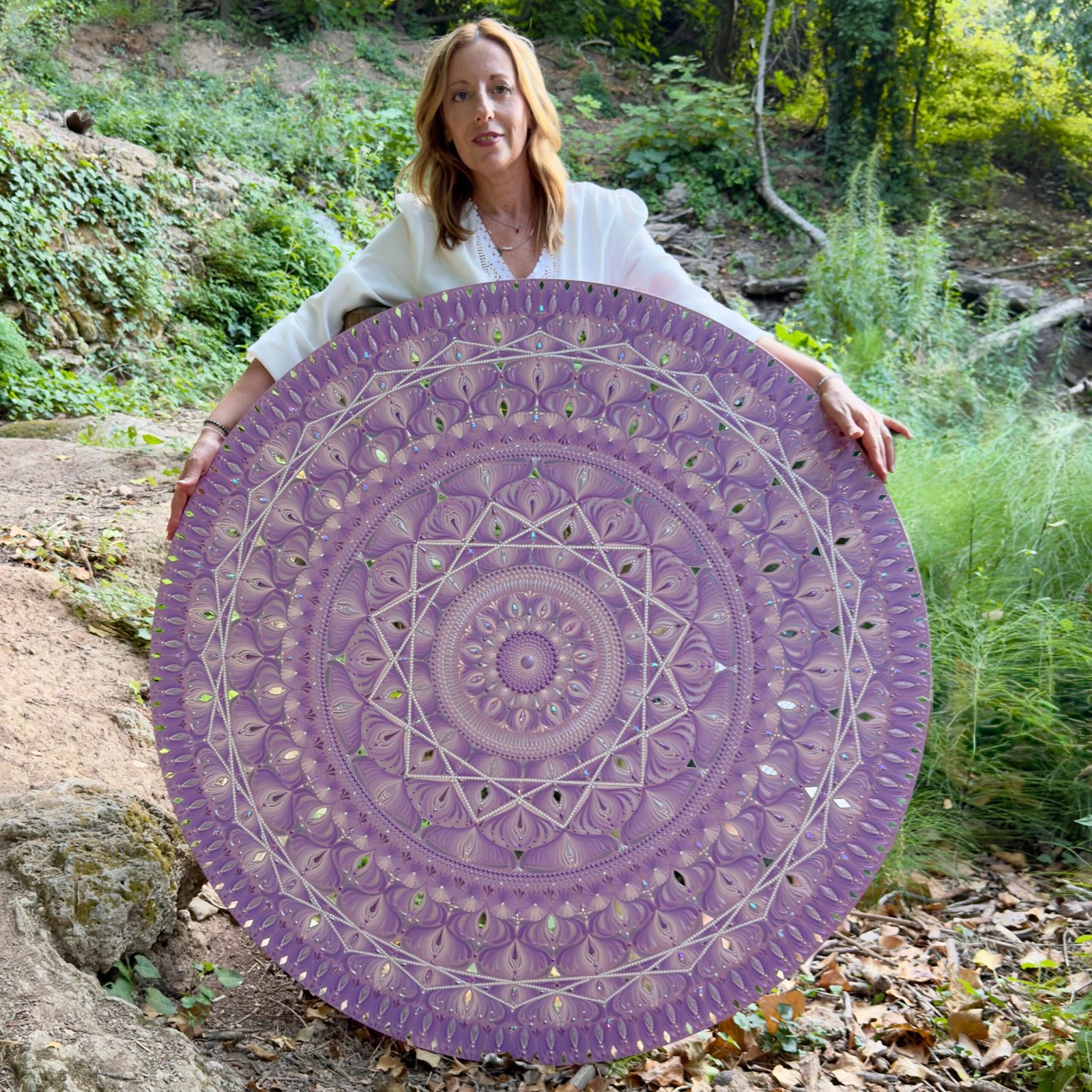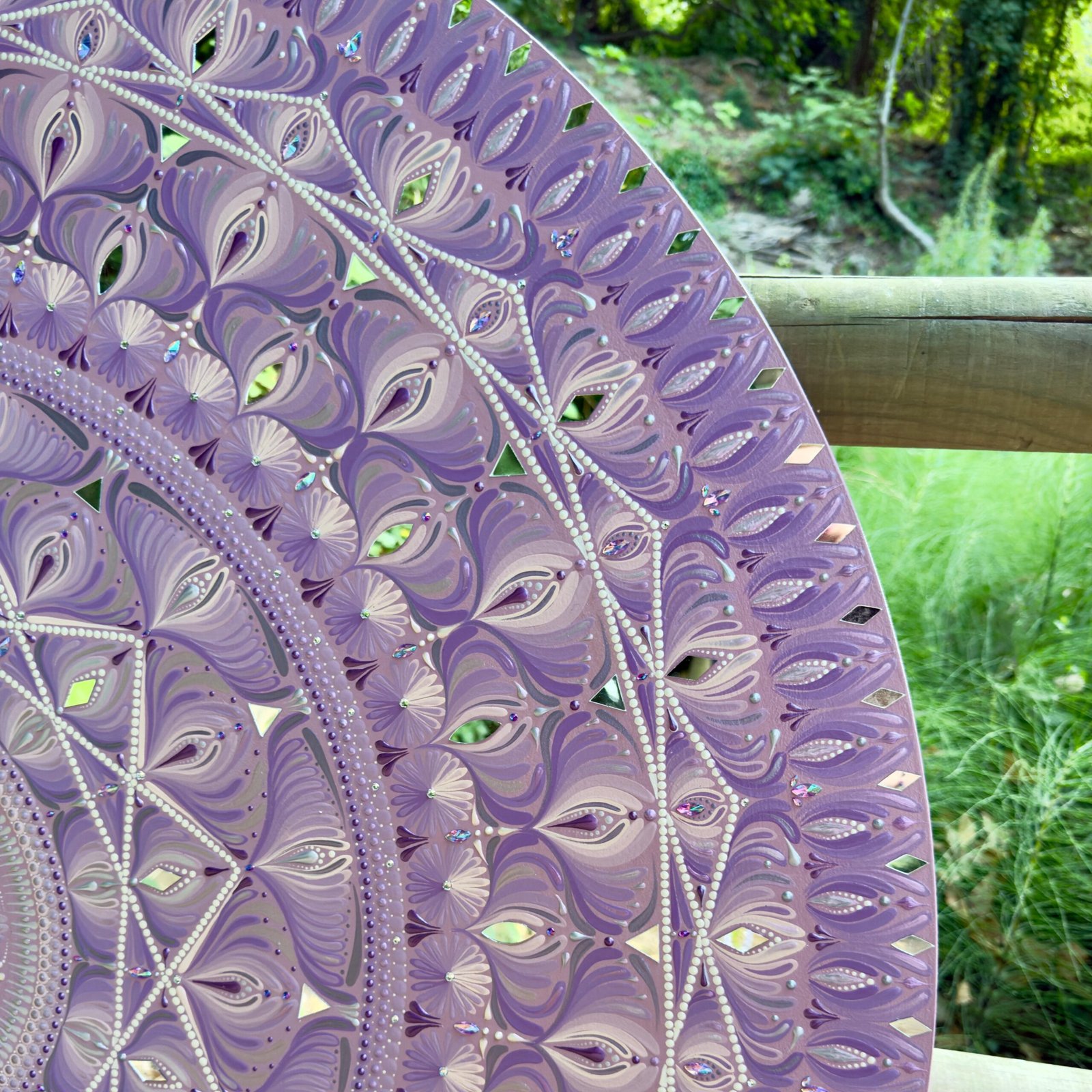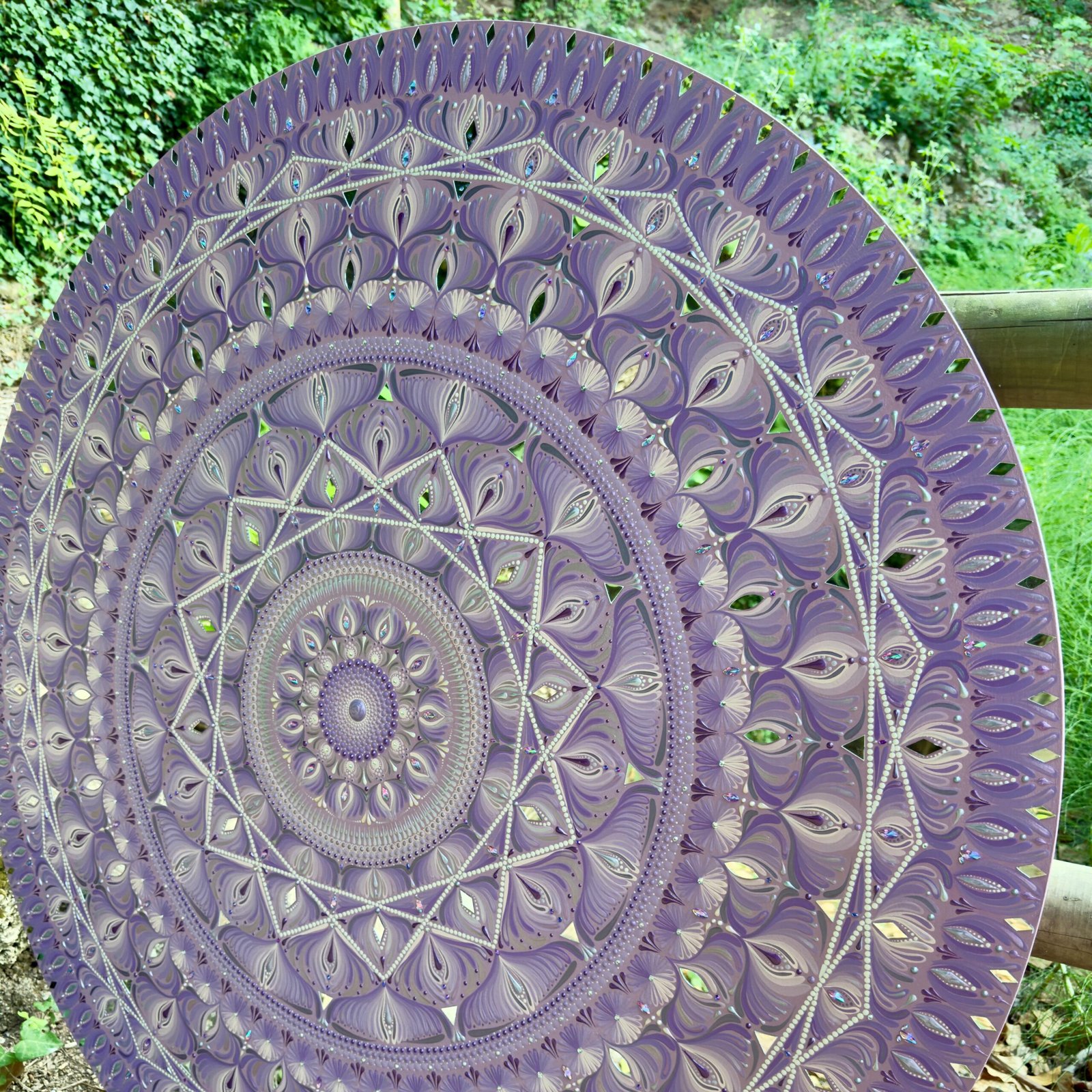 Este mandala de 120 cm de diámetro irradia fuerza y serenidad. Su color morado en degradé, simulando una amatista, evoca espiritualidad, protección y calma interior.