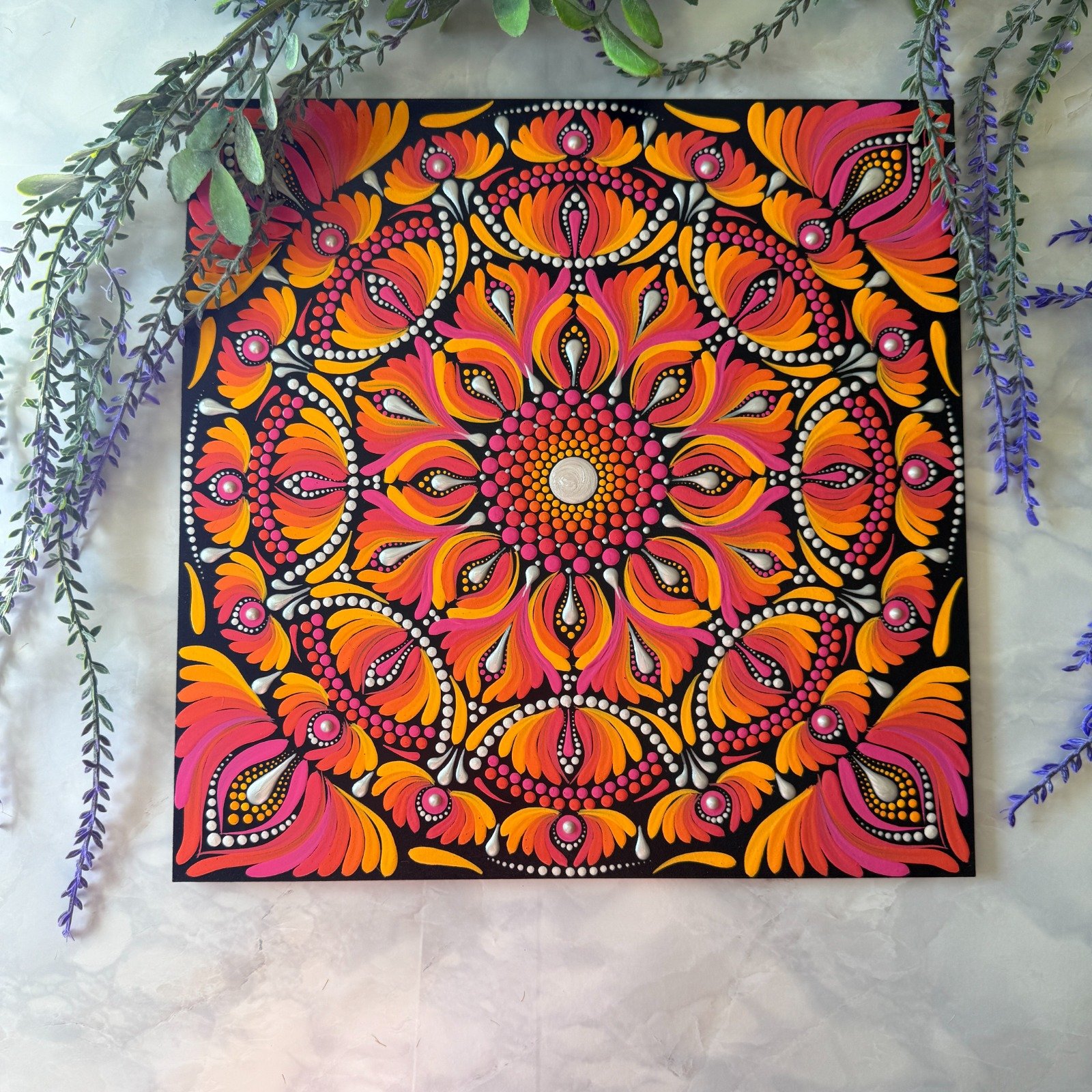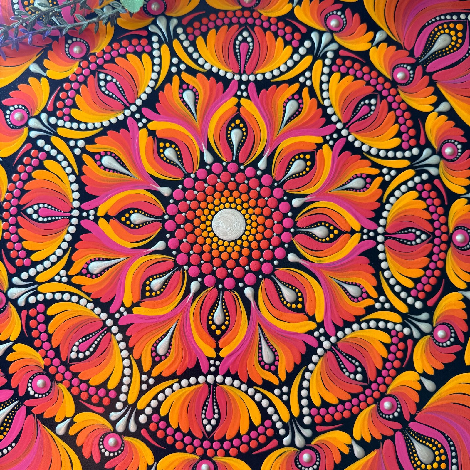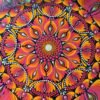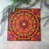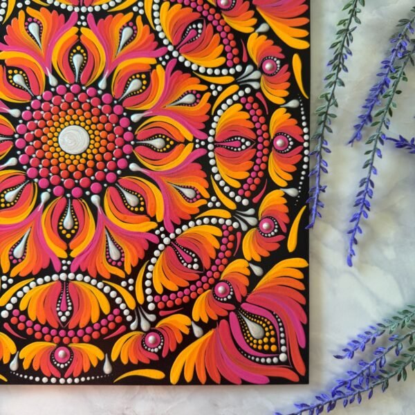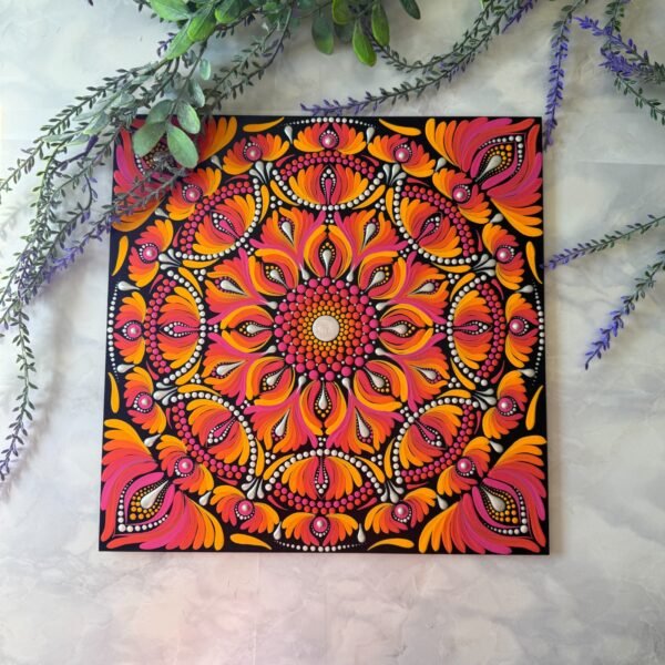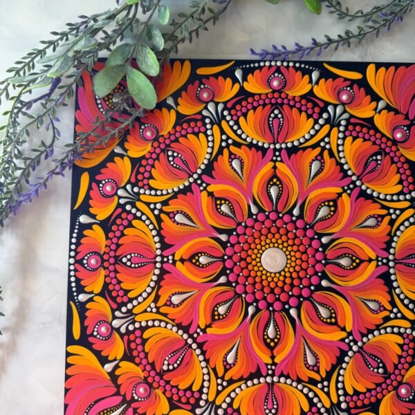 Este mandala evoca energía, transformación y vitalidad, representados por los vibrantes tonos naranjas, rosados y amarillos que simulan llamas danzantes. El centro brillante simboliza la esencia de la vida, irradiando fuerza hacia las capas exteriores.