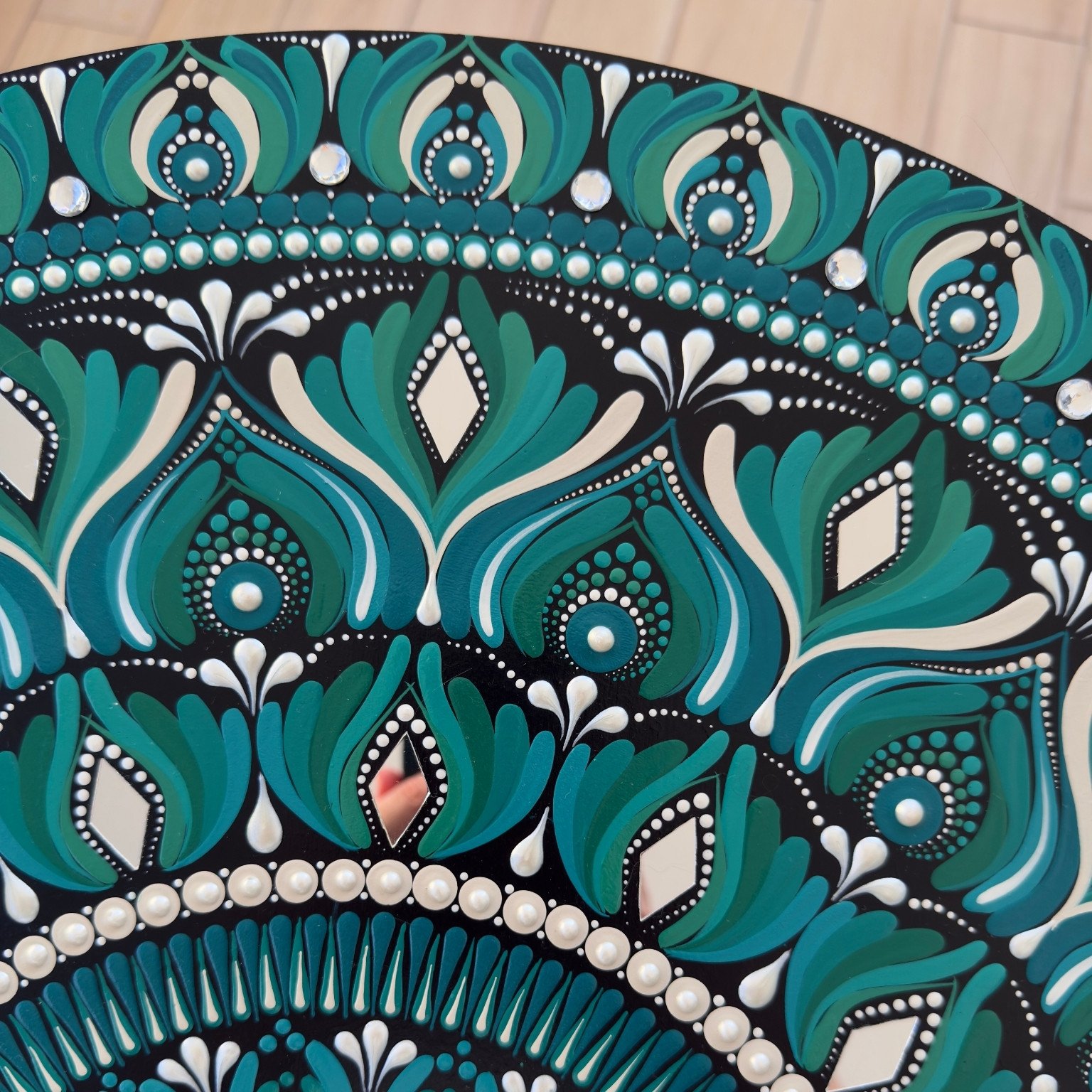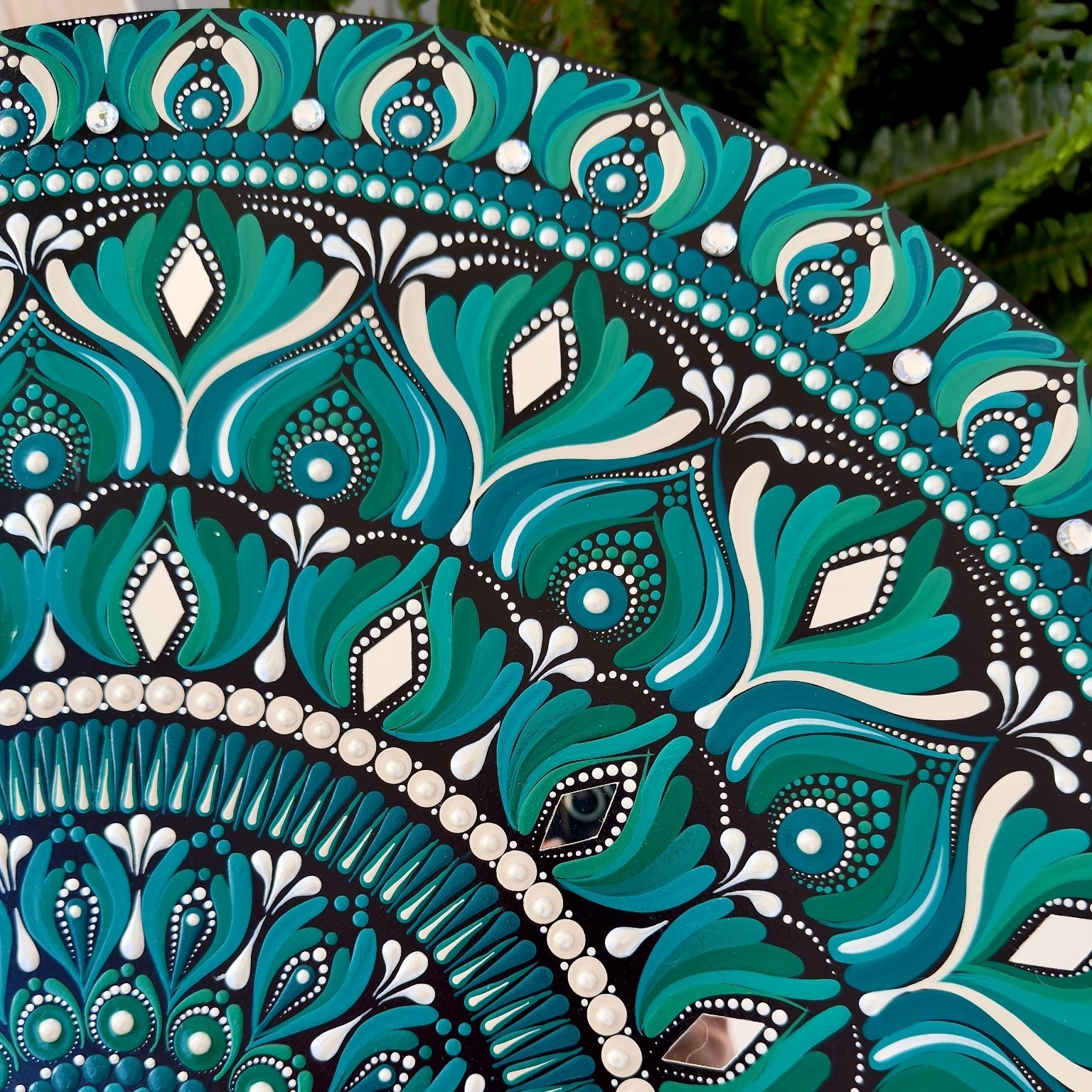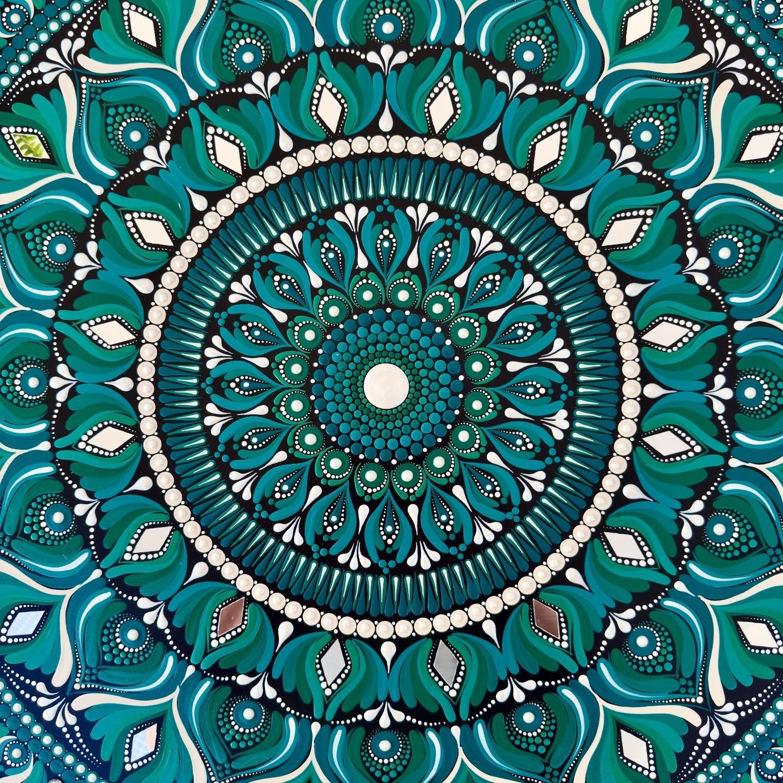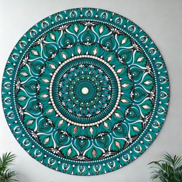 Este mandala es un homenaje a la armonía y la belleza que surgen cuando lo natural y lo brillante coexisten. Es un recordatorio de que incluso en la simplicidad, existe un destello único que ilumina todo a su alrededor.