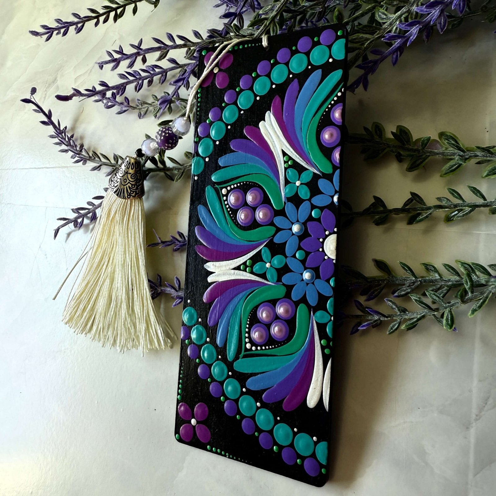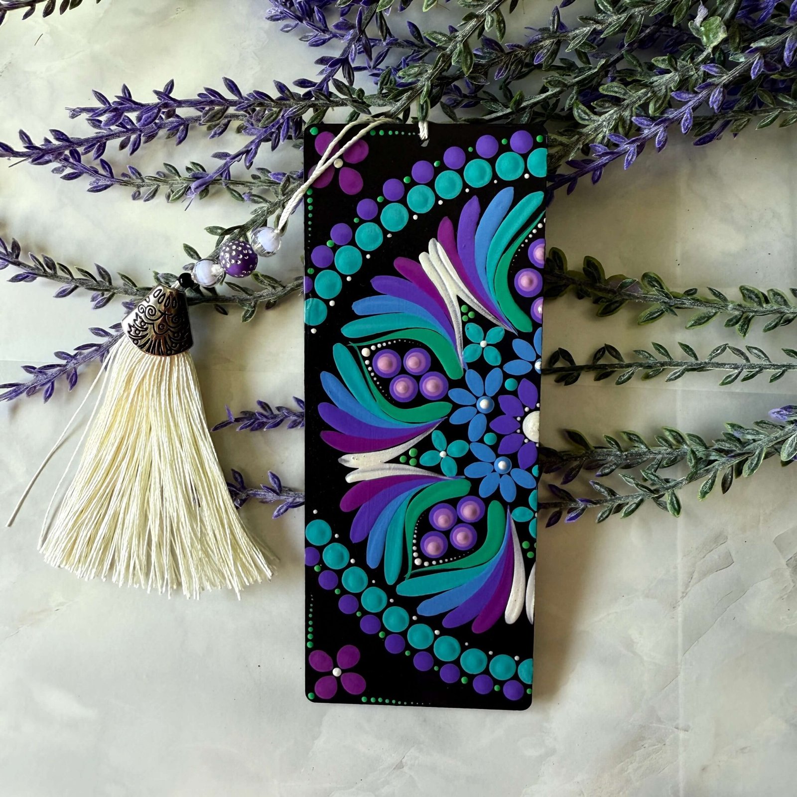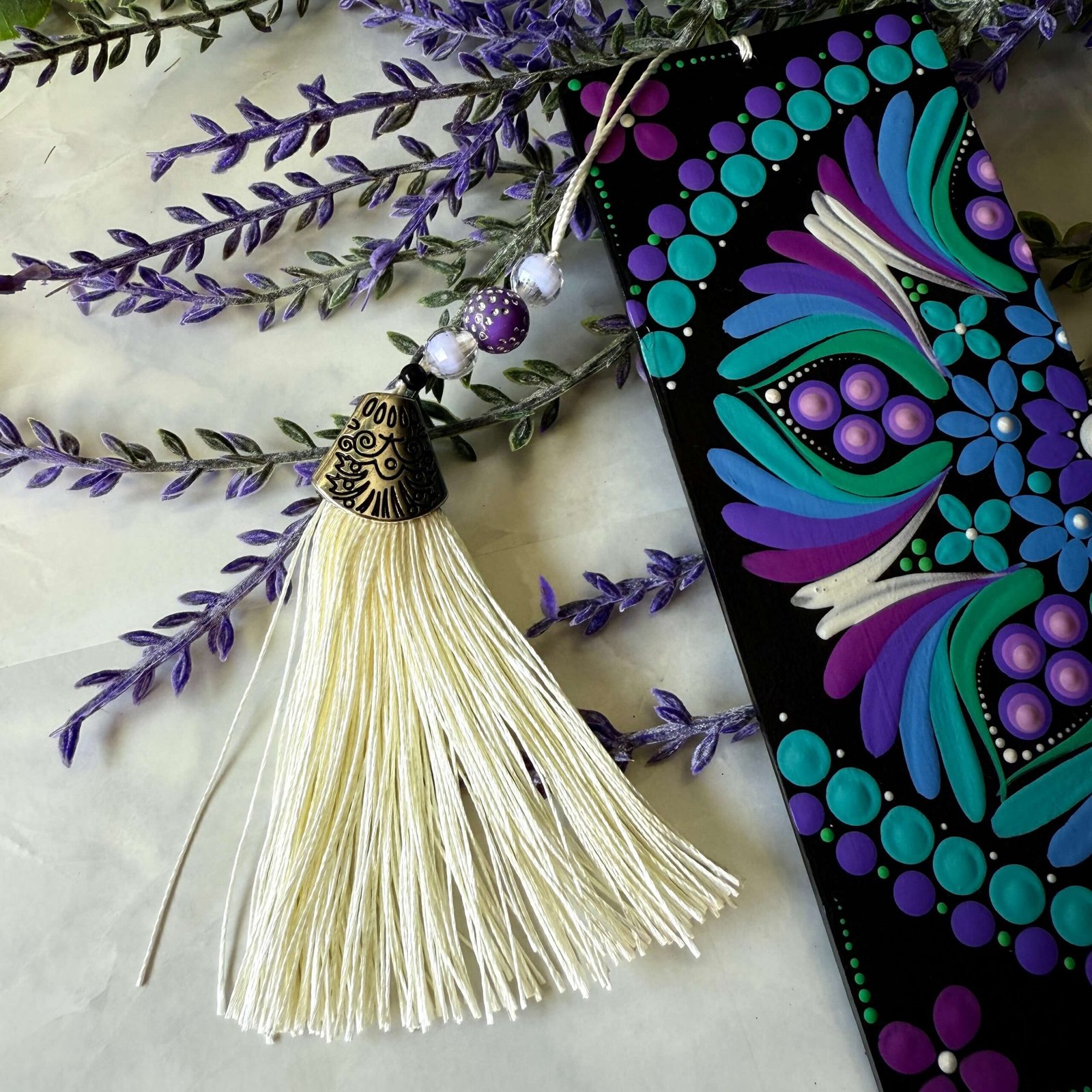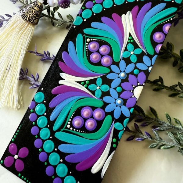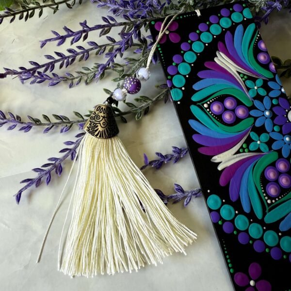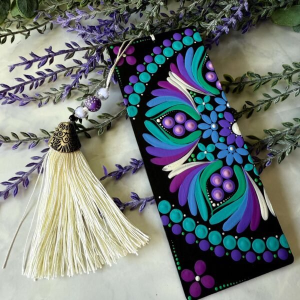 Cada marcapáginas ha sido cuidadosamente pintado a mano, convirtiéndolo en una pieza única que combina arte y funcionalidad. La borla de flecos con bolitas de colores añade un toque decorativo y alegre, haciendo que cada lectura se convierta en una experiencia más especial. Un accesorio práctico y encantador que aporta color y personalidad a tus libros.
