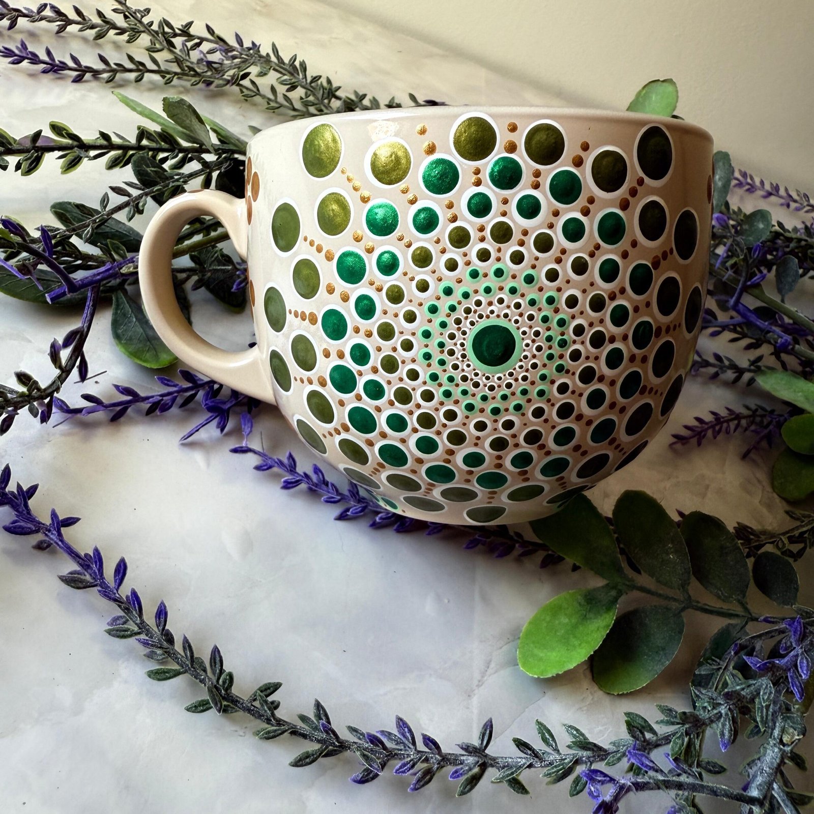 Cada taza Mandala pintada a mano es una pieza única, con un mandala exclusivo en la parte frontal que convierte cada taza en un pequeño objeto de arte.